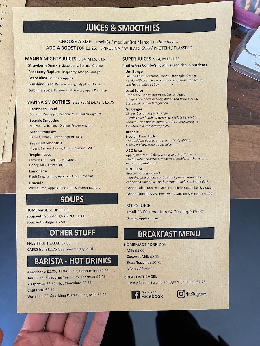 Welcome to Manna, a delightful café nestled at 5 Batchen Street, Elgin. Here, you'll find a menu bursting with flavor, focusing on fresh ingredients and a warm atmosphere. Start your day with their satisfying Breakfast Bagel for just £7.75, or quench your thirst with one of their refreshing Manna Smoothies, like the Caribbean Cloud or Tropical Love.